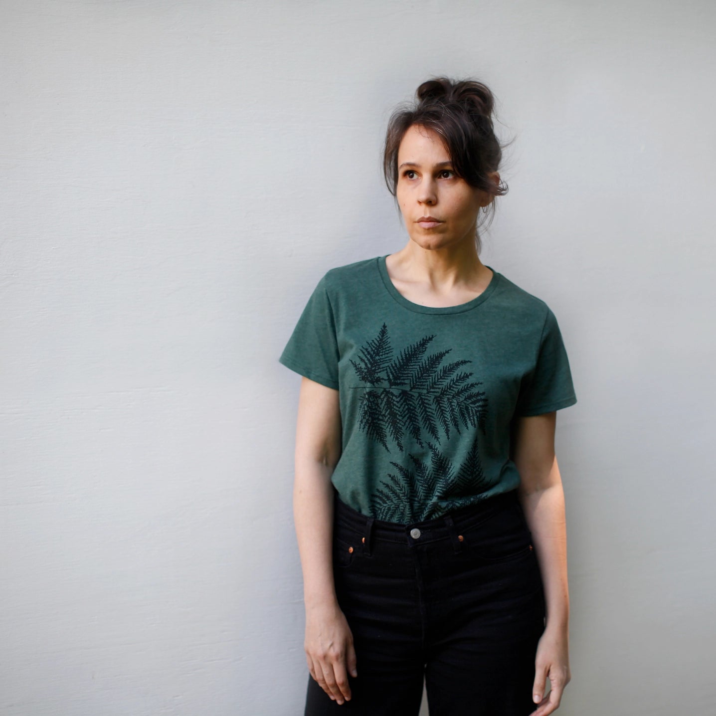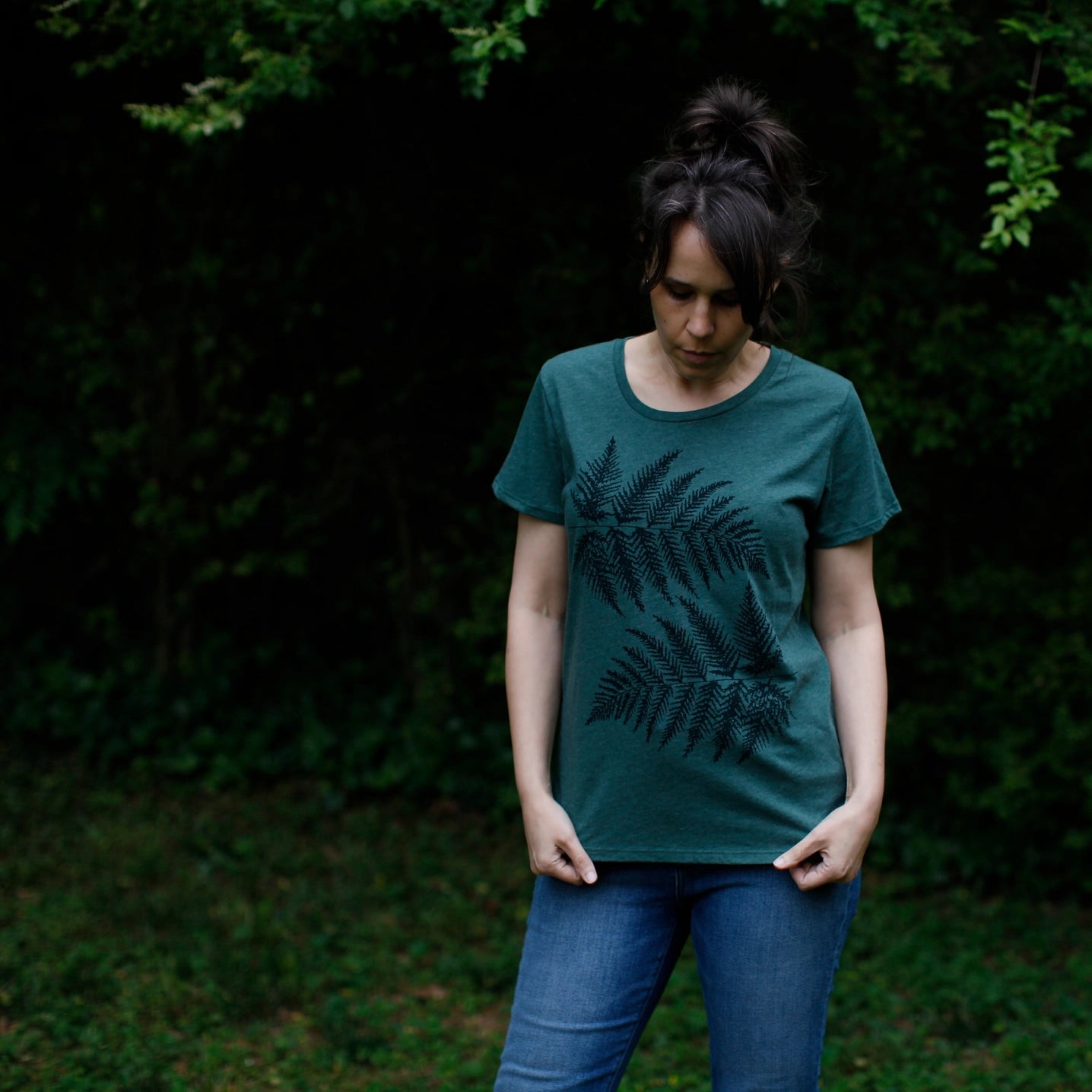 Forest green. Made in USA. 50% organic cotton / 50% recycled polyester. Model is wearing a LARGE.