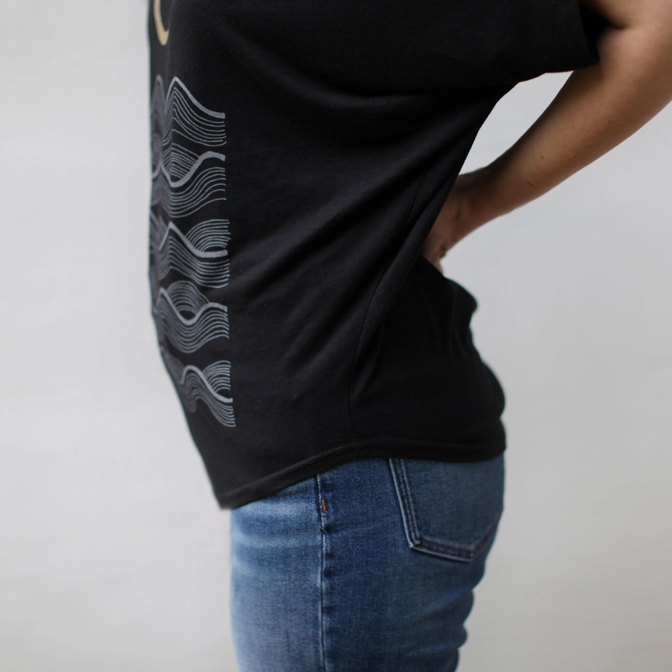 Solid black. Made in the USA. Printed with water-based gold and light gray ink. Fiber content: 70% viscose bamboo / 30% ring spun organic cotton.