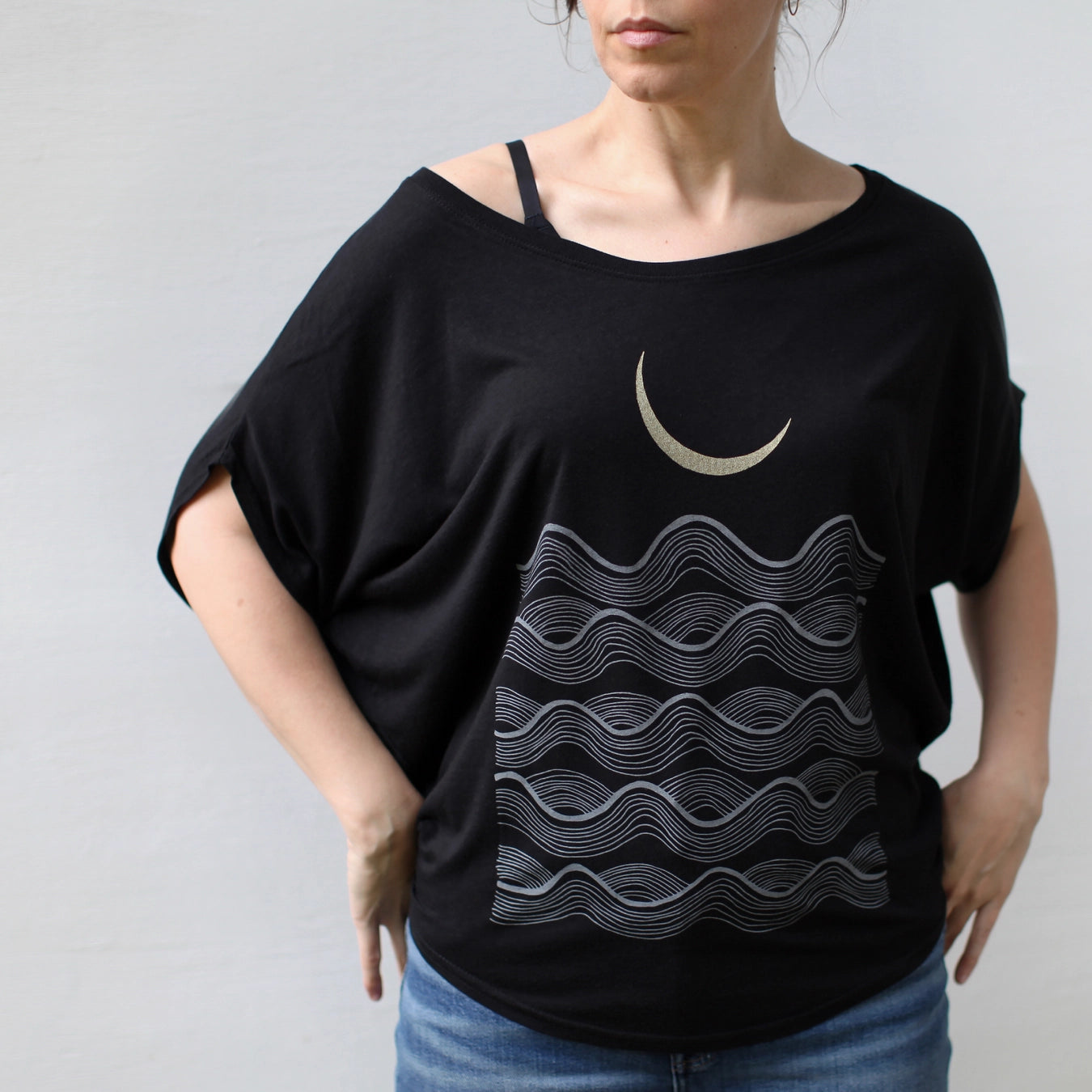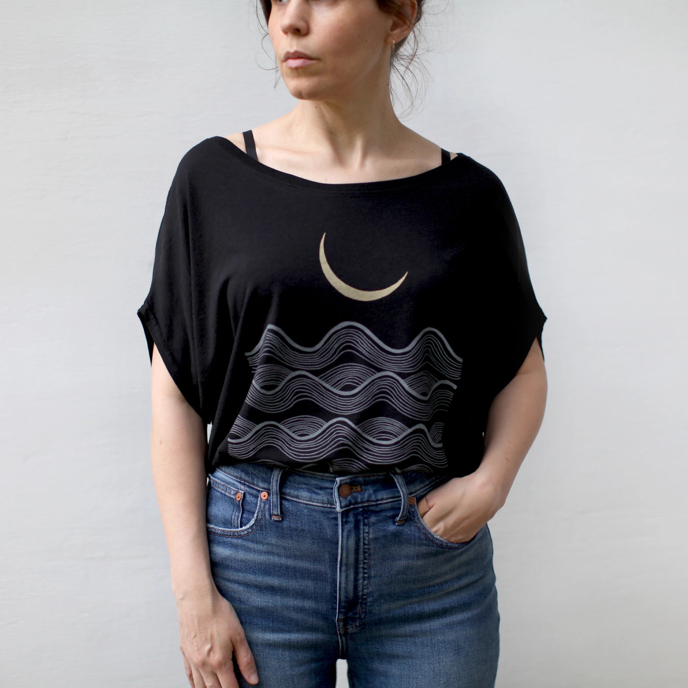 Full Fathoms print features a stack of pale gray waves and a gold crescent moon hovering overhead.