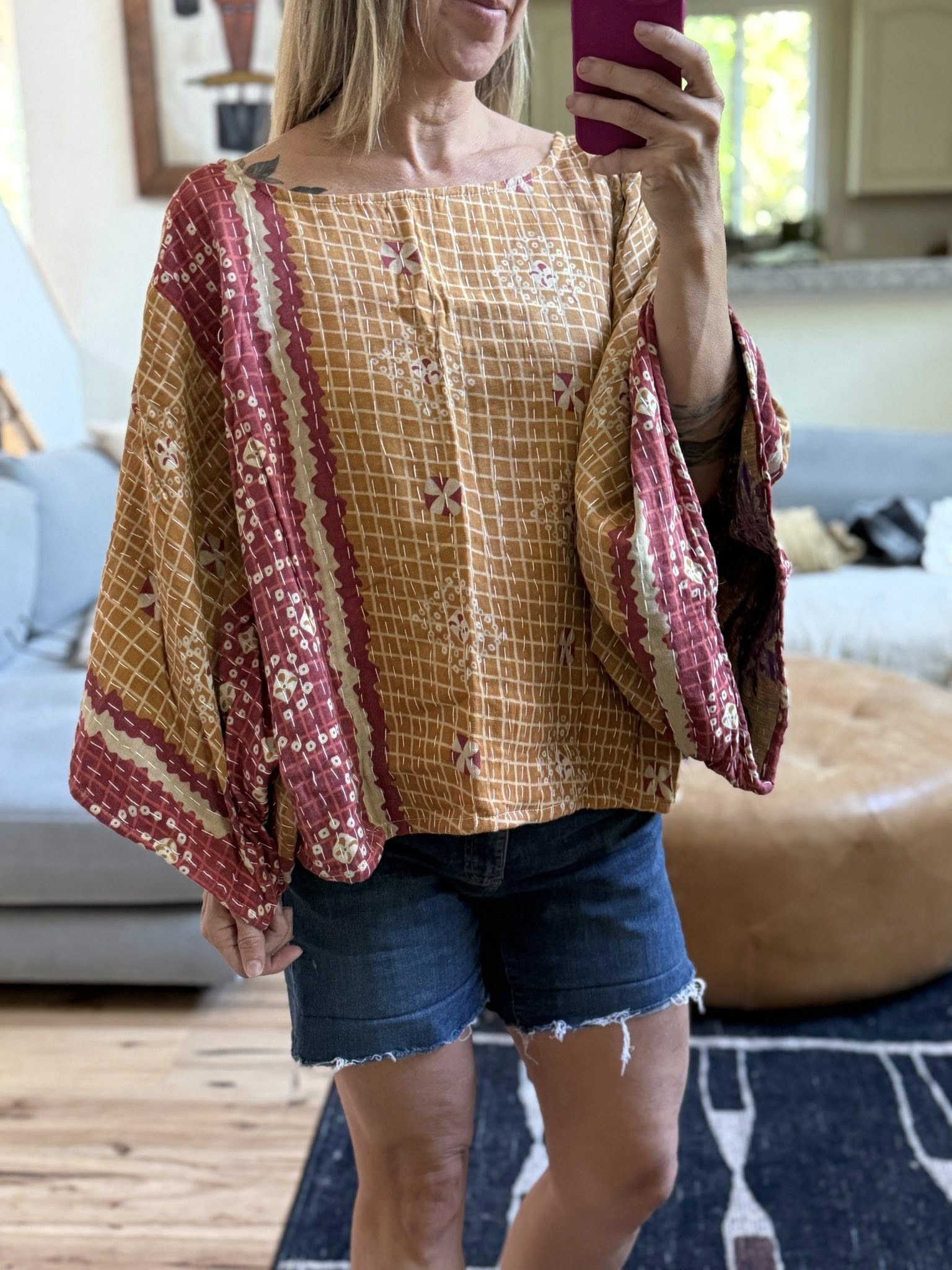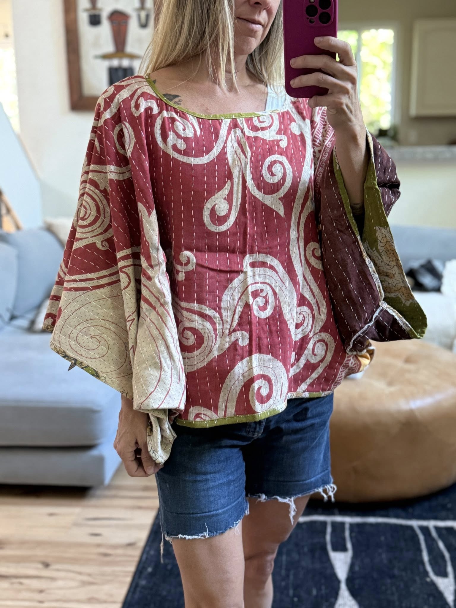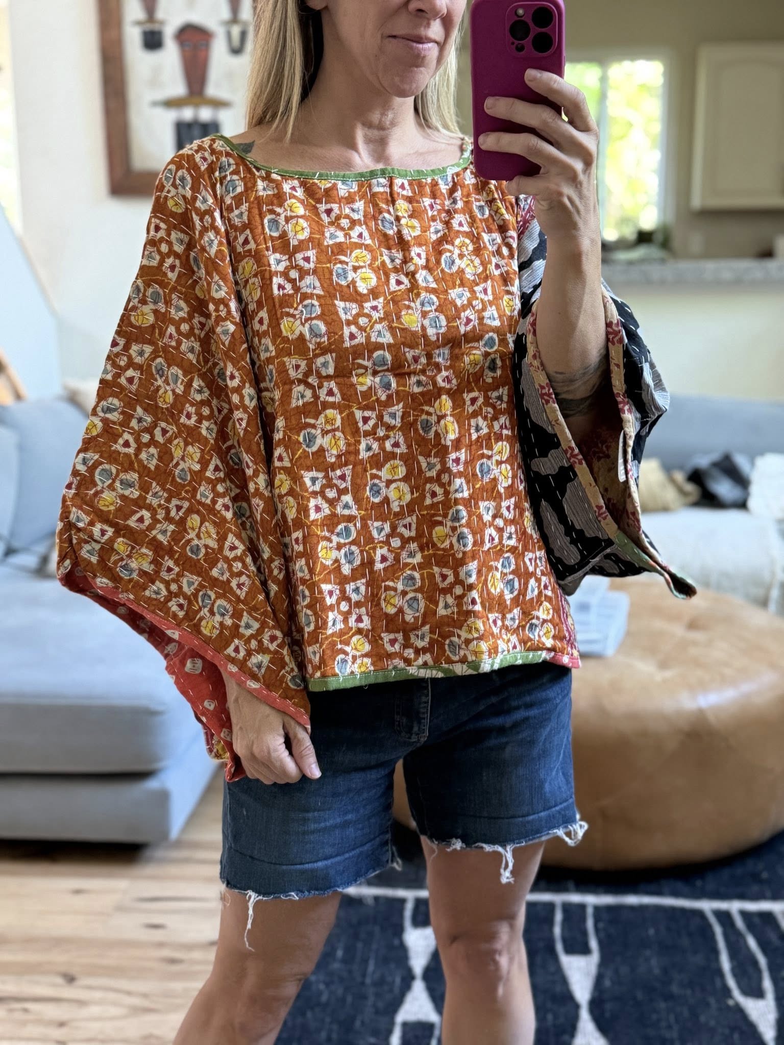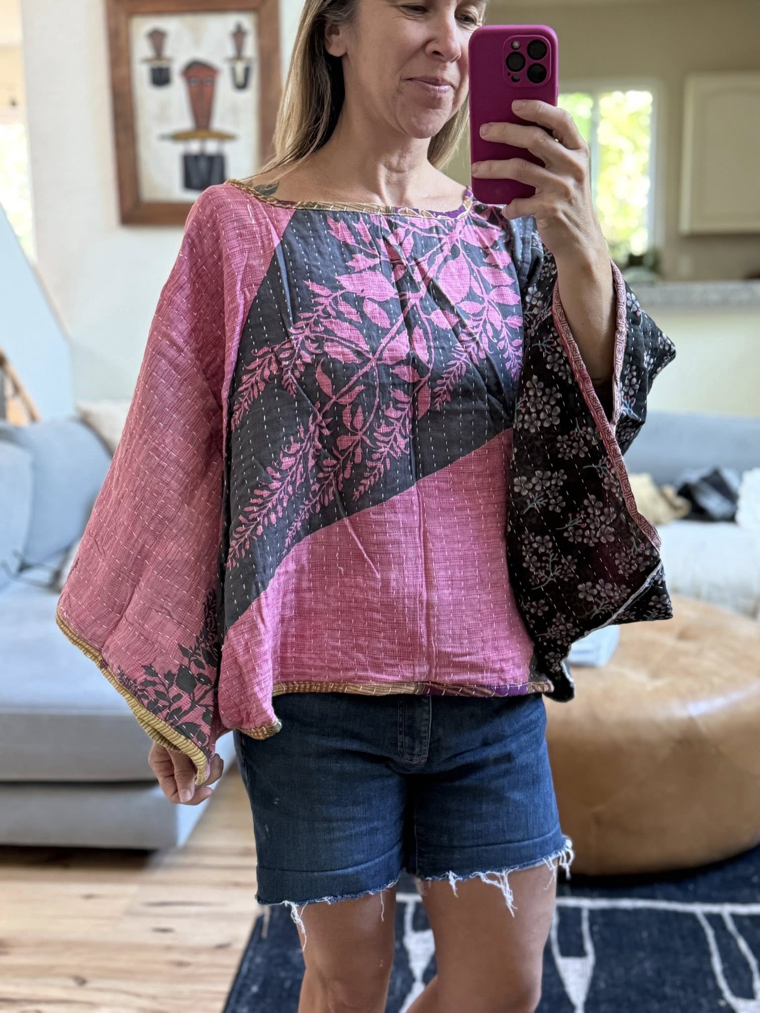 A note about Kantha fabric: Kantha fabric is created using new and vintage fabrics and may sometimes have small holes, spots and loose threads. This does not impact the wearability and integrity of the Kantha fabric. We hope you embrace the beauty and loved quality of each unique kantha item!