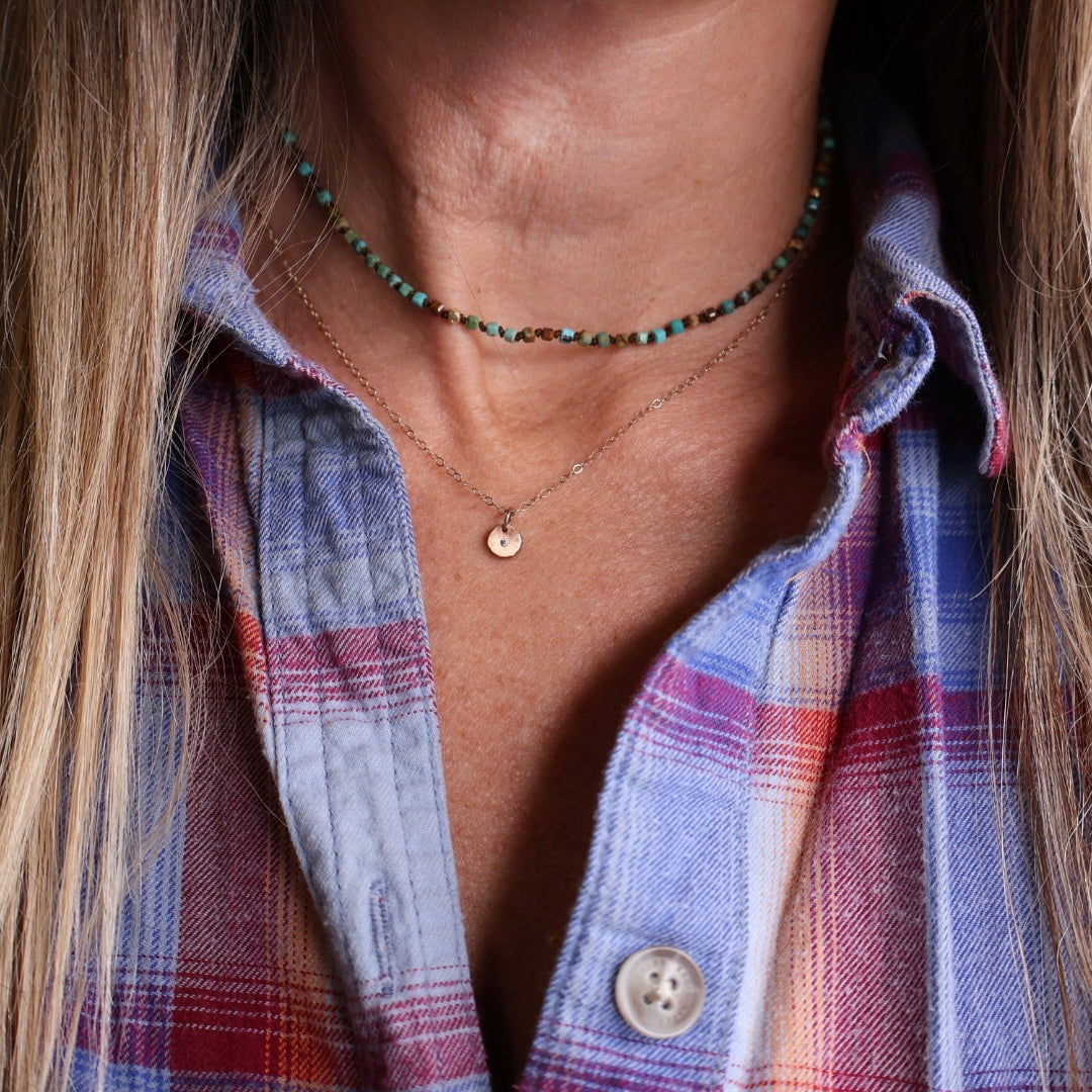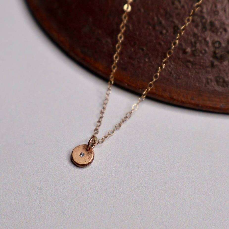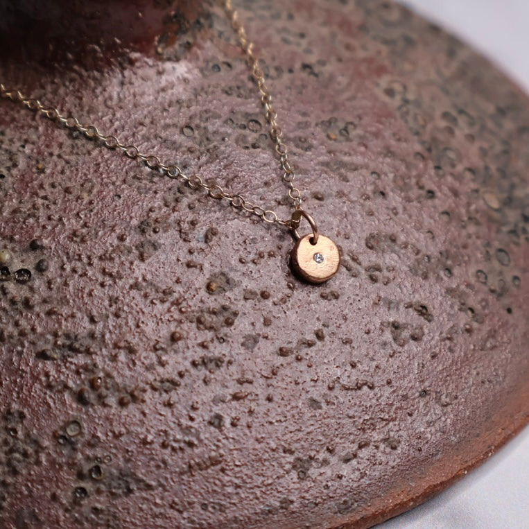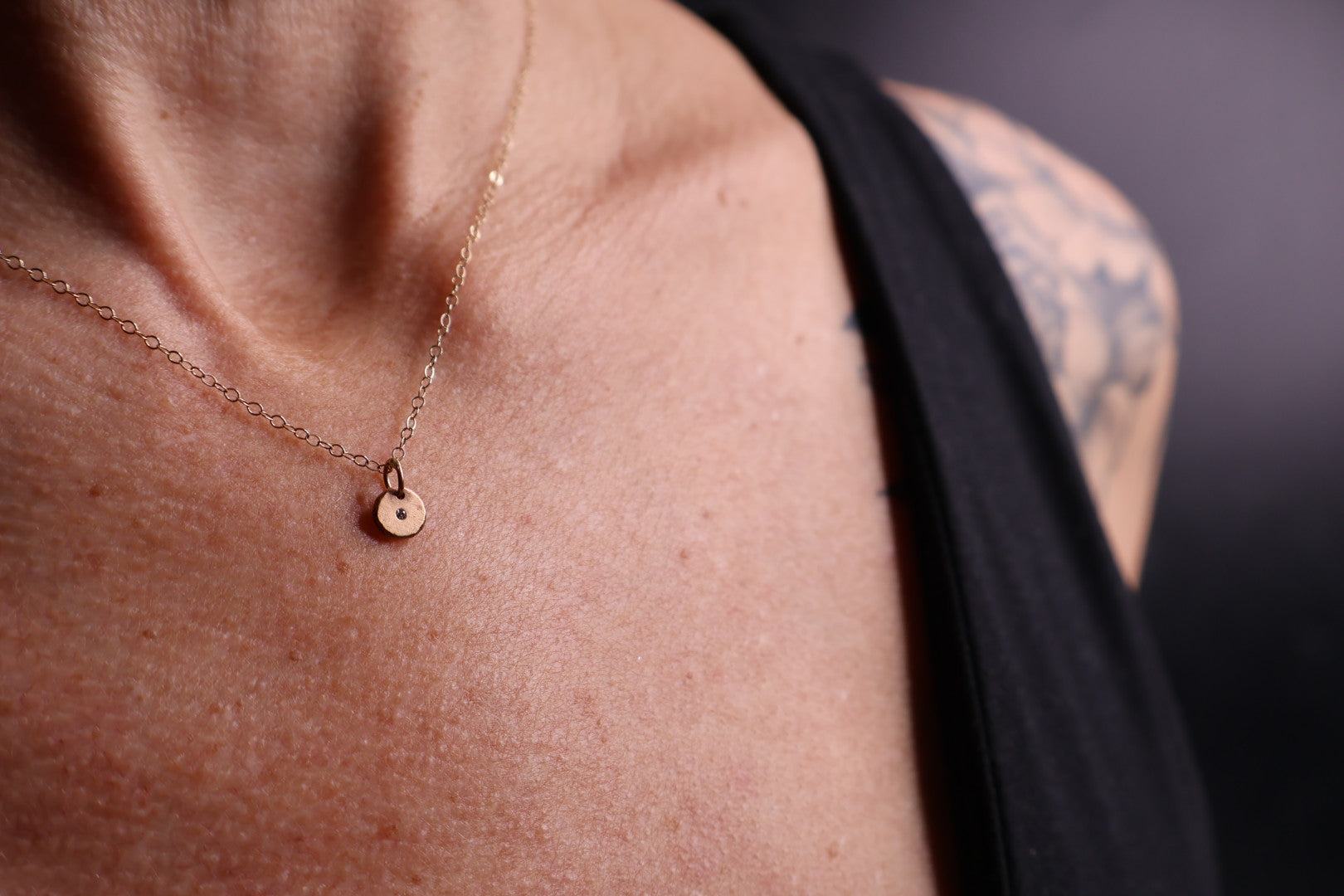Have something against river rocks? (LOL), then choose the classic puddle with its 2-pt diamond, in 14kt gold or sterling silver. Also, hanging from the textured, oxidized chain, these guys are a great set it and forget it necklace, easily worn from day to night. Each piece will be unique as these are made from recycled metal and hand formed.