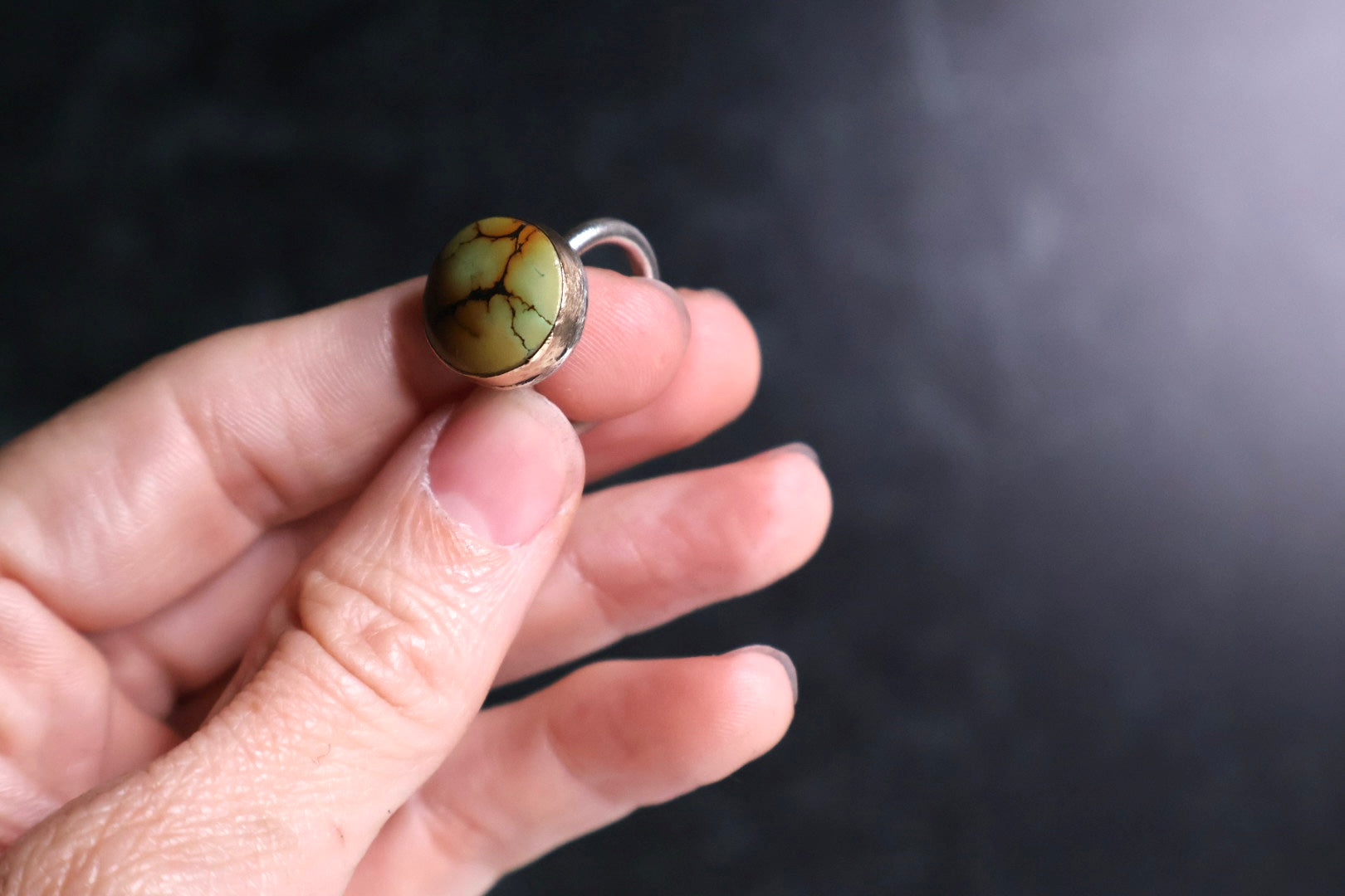 Giraffe Turquoise is such a killer stone! Browns, oranges, greens, yellows all collide to present a gorgeous array--accented by a 14kt gold bezel and matte solid round band.