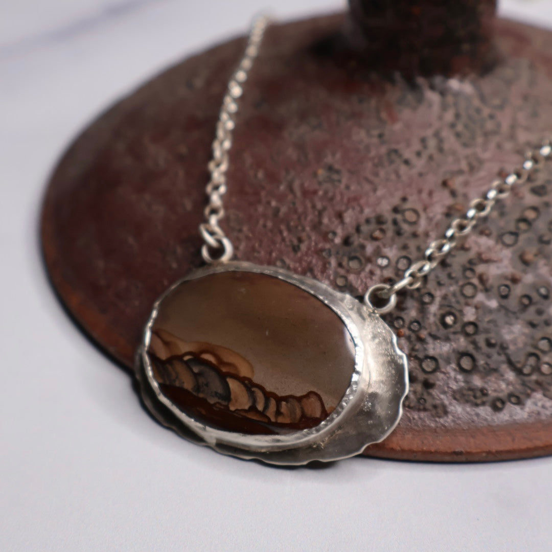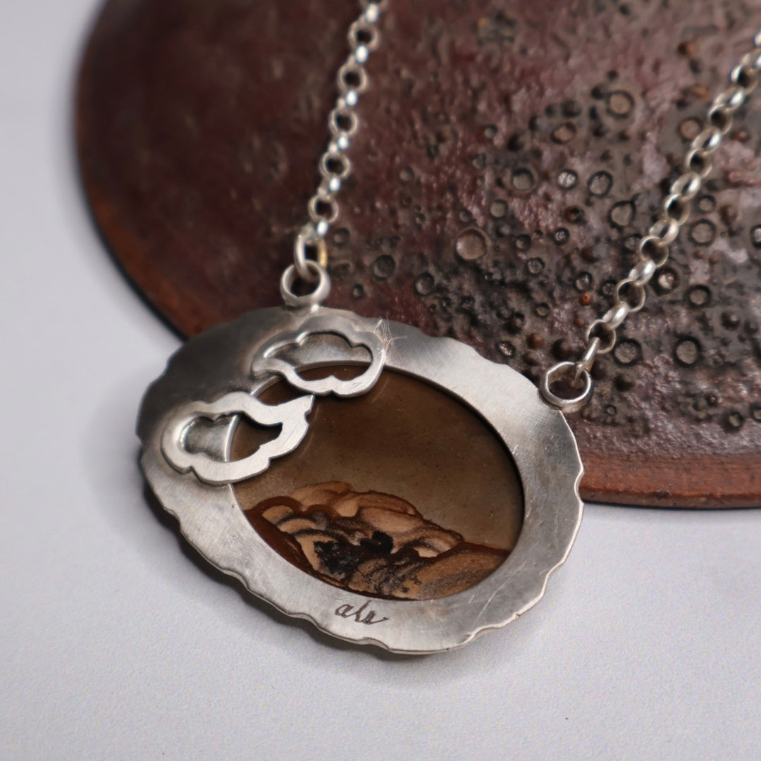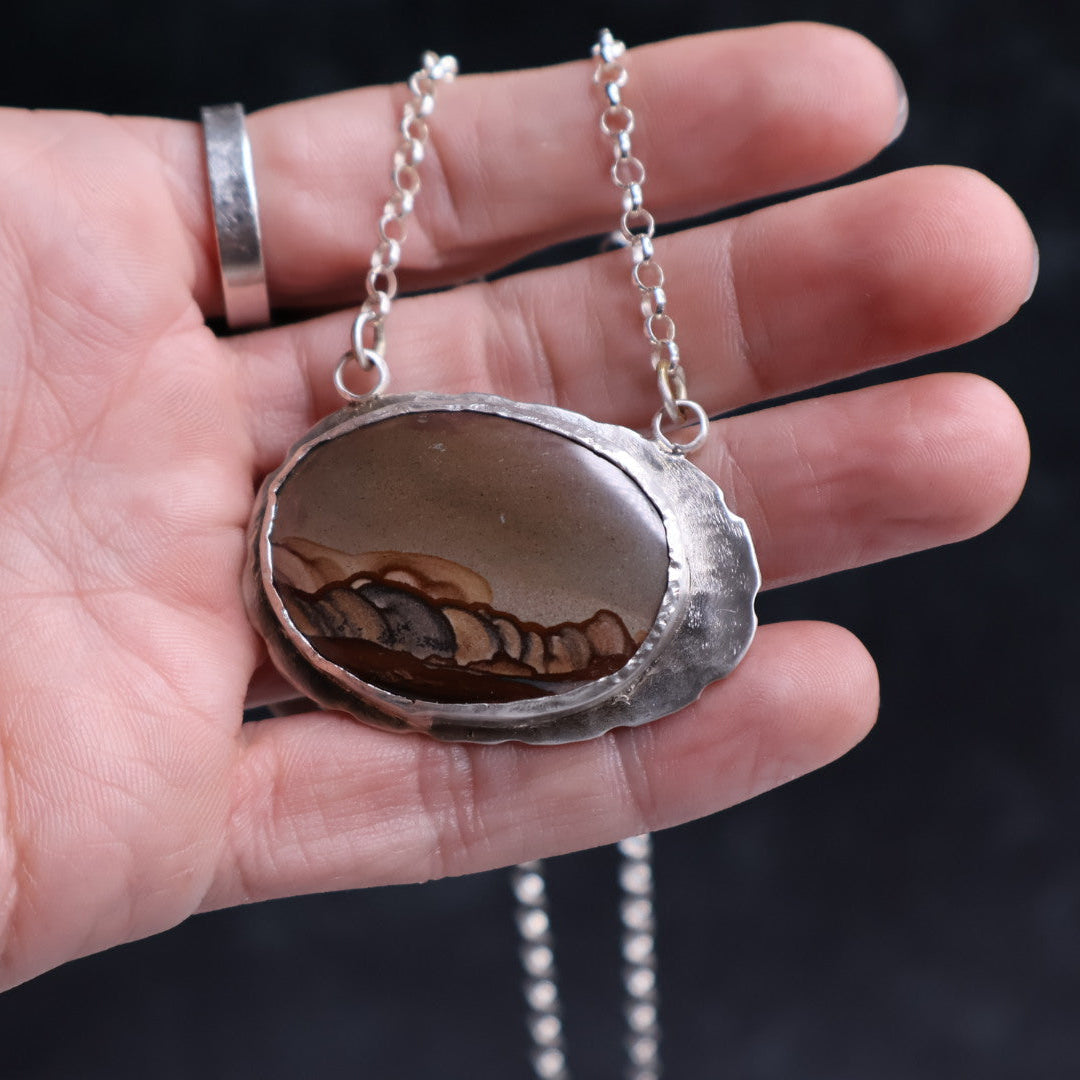 REVERSIBLE large oval Deschutes Picture Jasper necklace in deep earthtones, resembling rugged rolling hills, set on sterling silver hammered backplate. On reverse side, flip to to find saw-cut drifting clouds overlay. Sterling silver chunky rolo chain. 20"