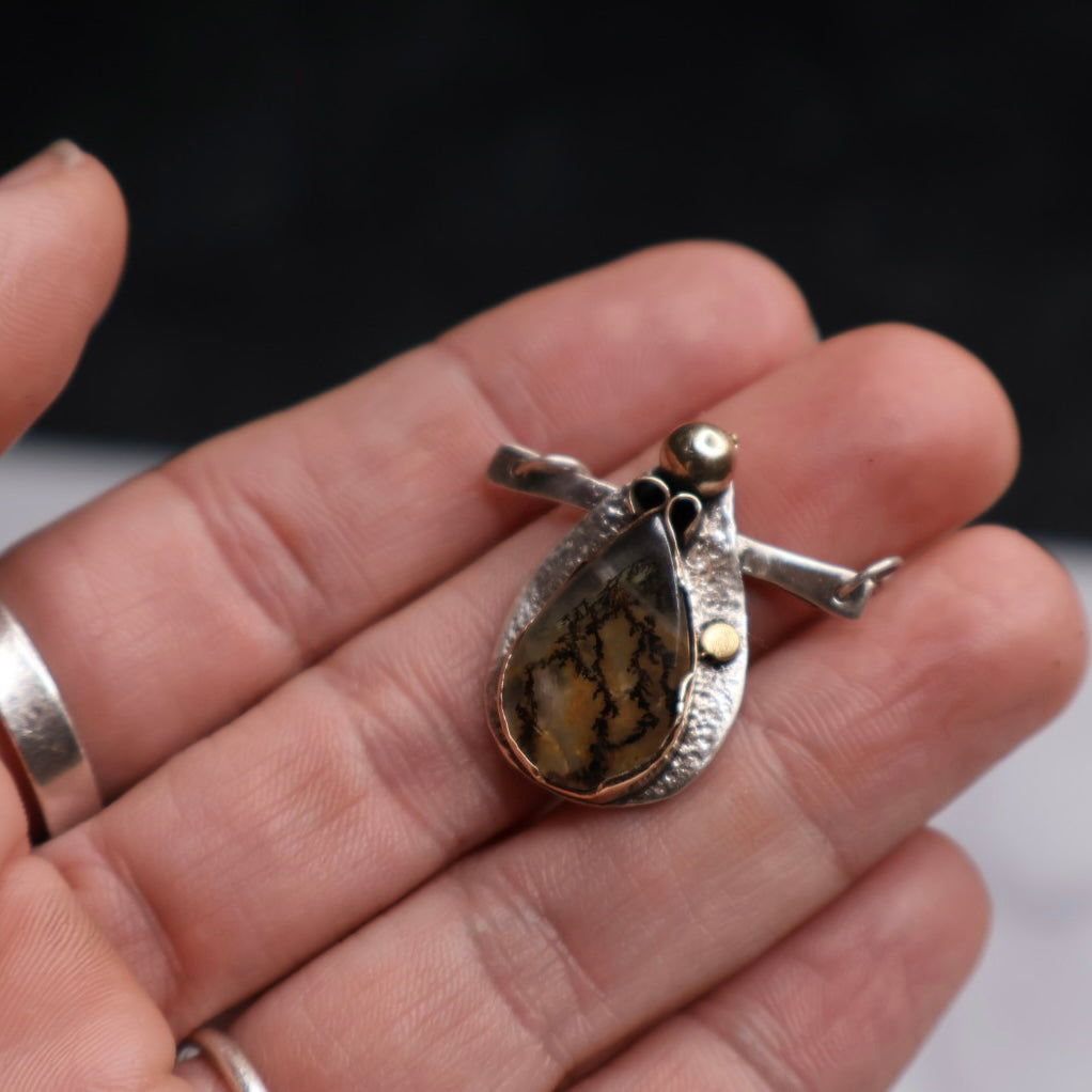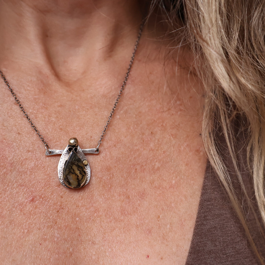 Teardrop-shaped natural cocoa-colored Dendrite stone on sterling silver, with 14kt gold bezel and accent. 17.5" chain.