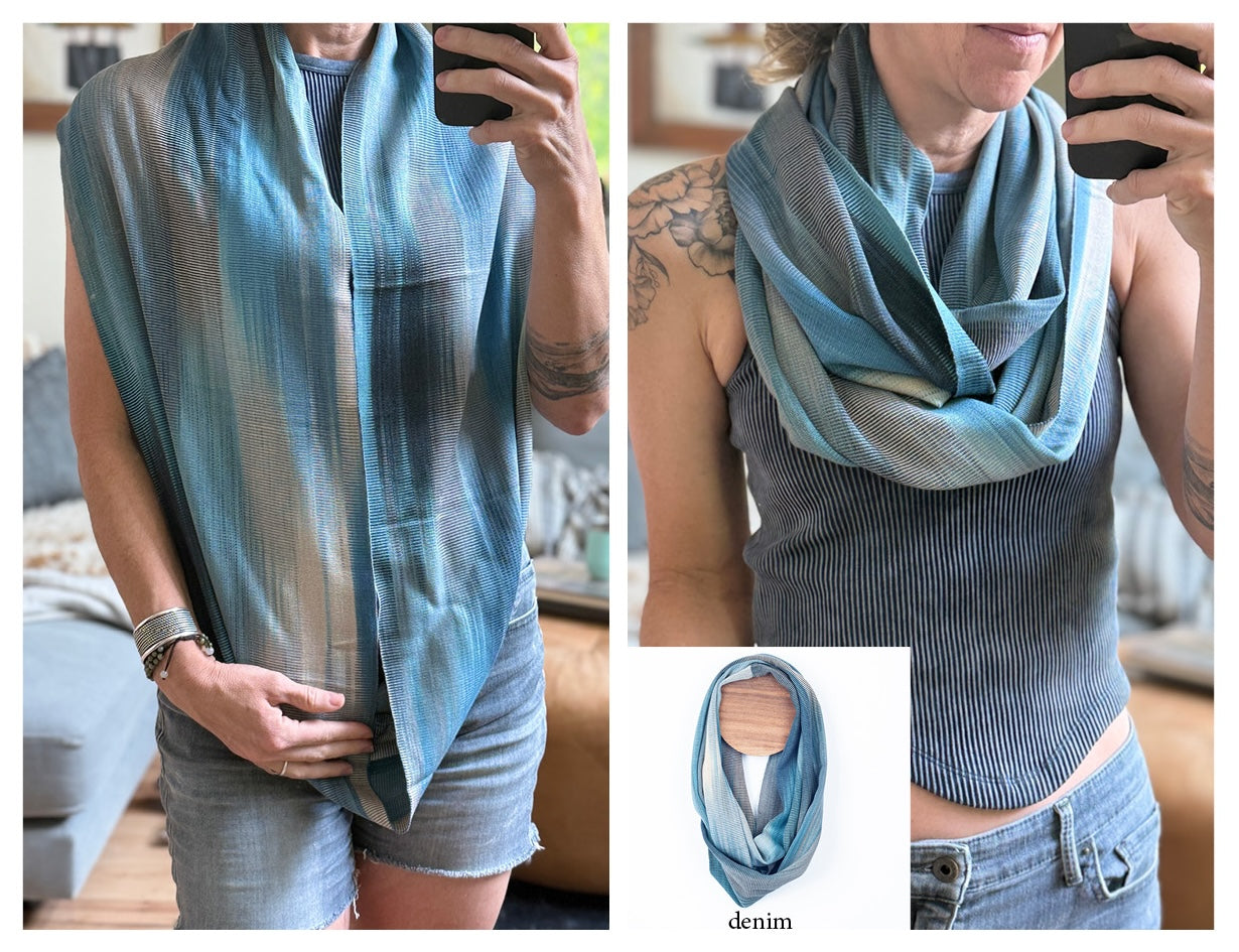 Silky weave infinity scarves handwoven from luxurious and sustainable 100% organic bamboo. They are handwoven on a traditional back strap loom by a Mayan Women’s cooperative in the highlands of Guatemala. They are hand dyed using traditional ikat technique, featuring a sophisticated, rich color palette and exceptionally soft hand.