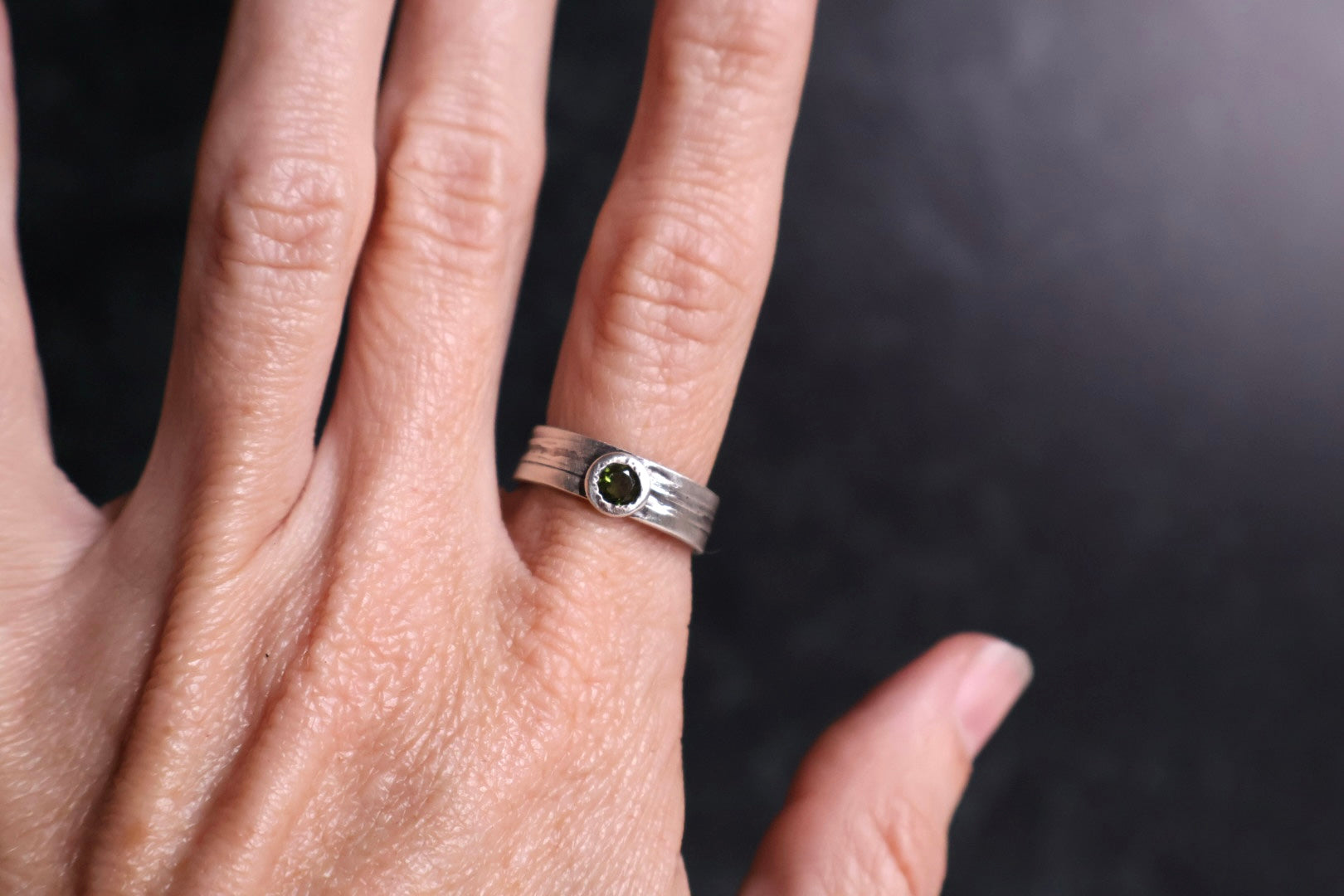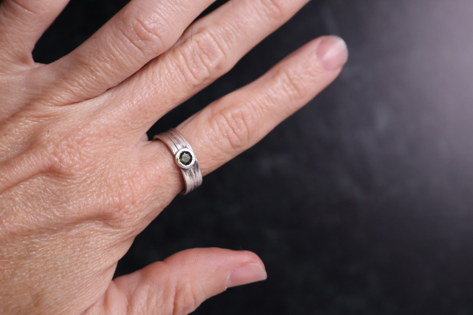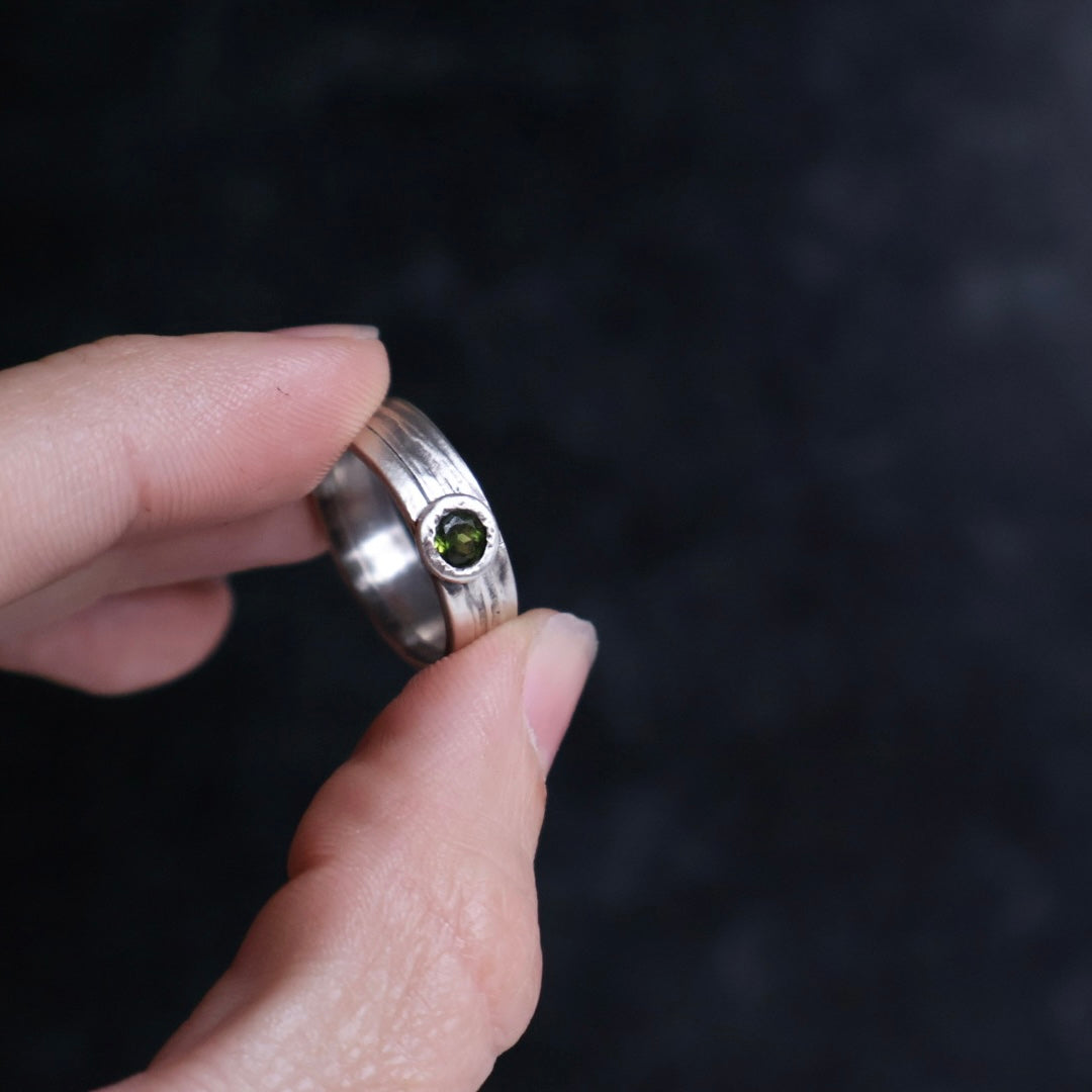 Wood textured wide band with dark green tourmaline in satellite setting.